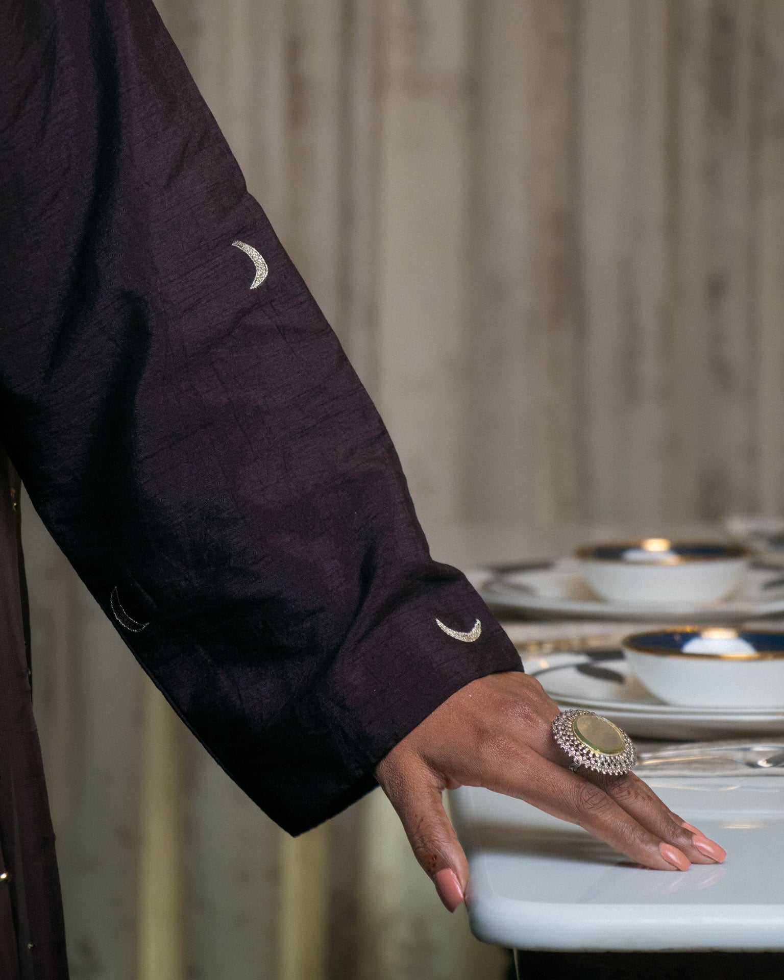 Mahtaab: A coffee brown long kurta and pants set adorned with moon motifs and self sequins throughout. Paired with a contrasting dupatta hand-embellished with sequins all over. Effortlessly chic with a touch of celestial elegance.