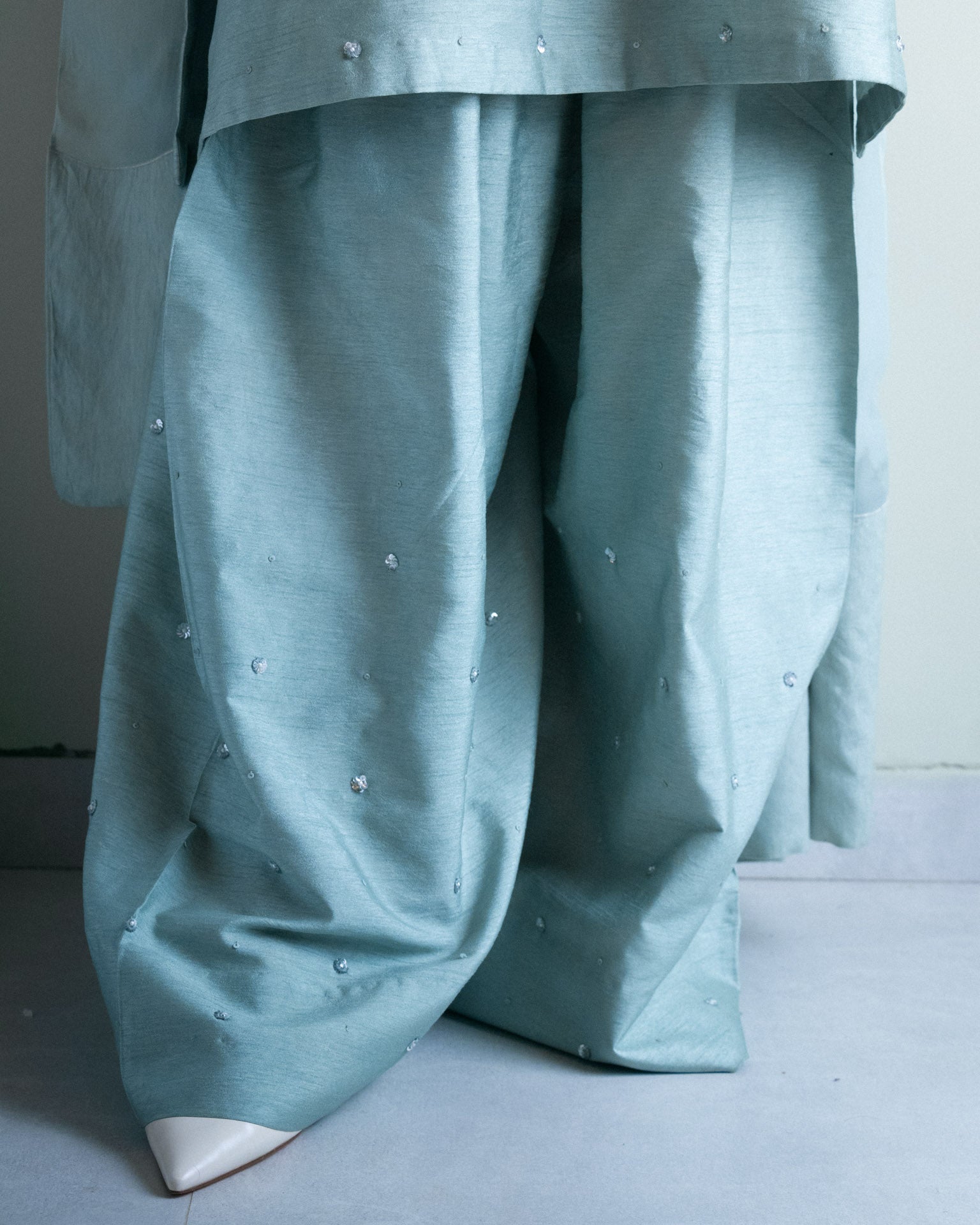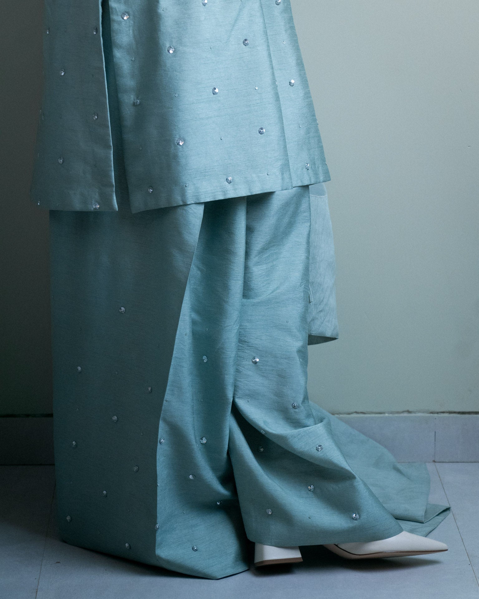 Sitara: A premium raw silk shirt and Pakistani shalwar in ice blue-green. Hand- embellished with silver and self-color sequins throughout. Paired with a soft organza dupatta featuring raw scallop finishing. Luxurious elegance in every detail.