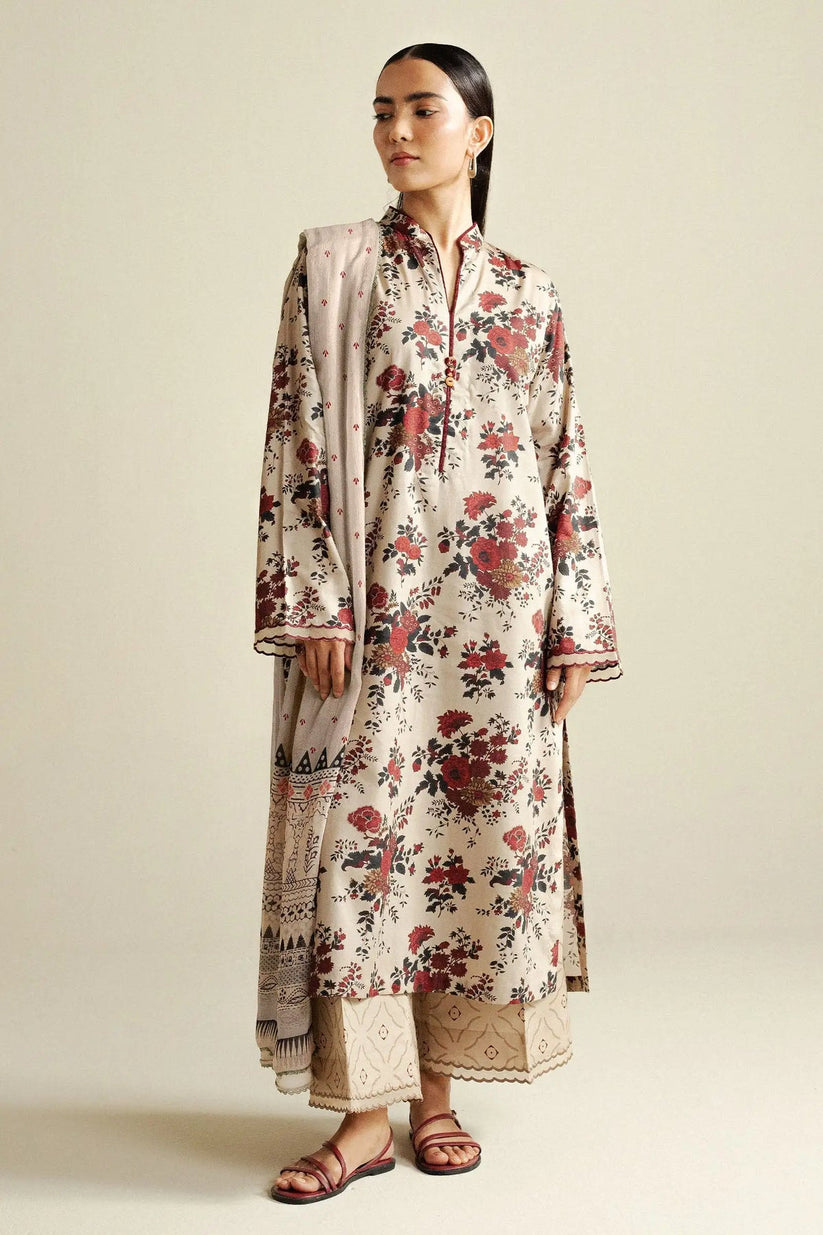 A soft mocha mousse shirt enlivened with a colorful print, paired with a printed trouser and a vibrant dupatta that adds a cool, contemporary balance.