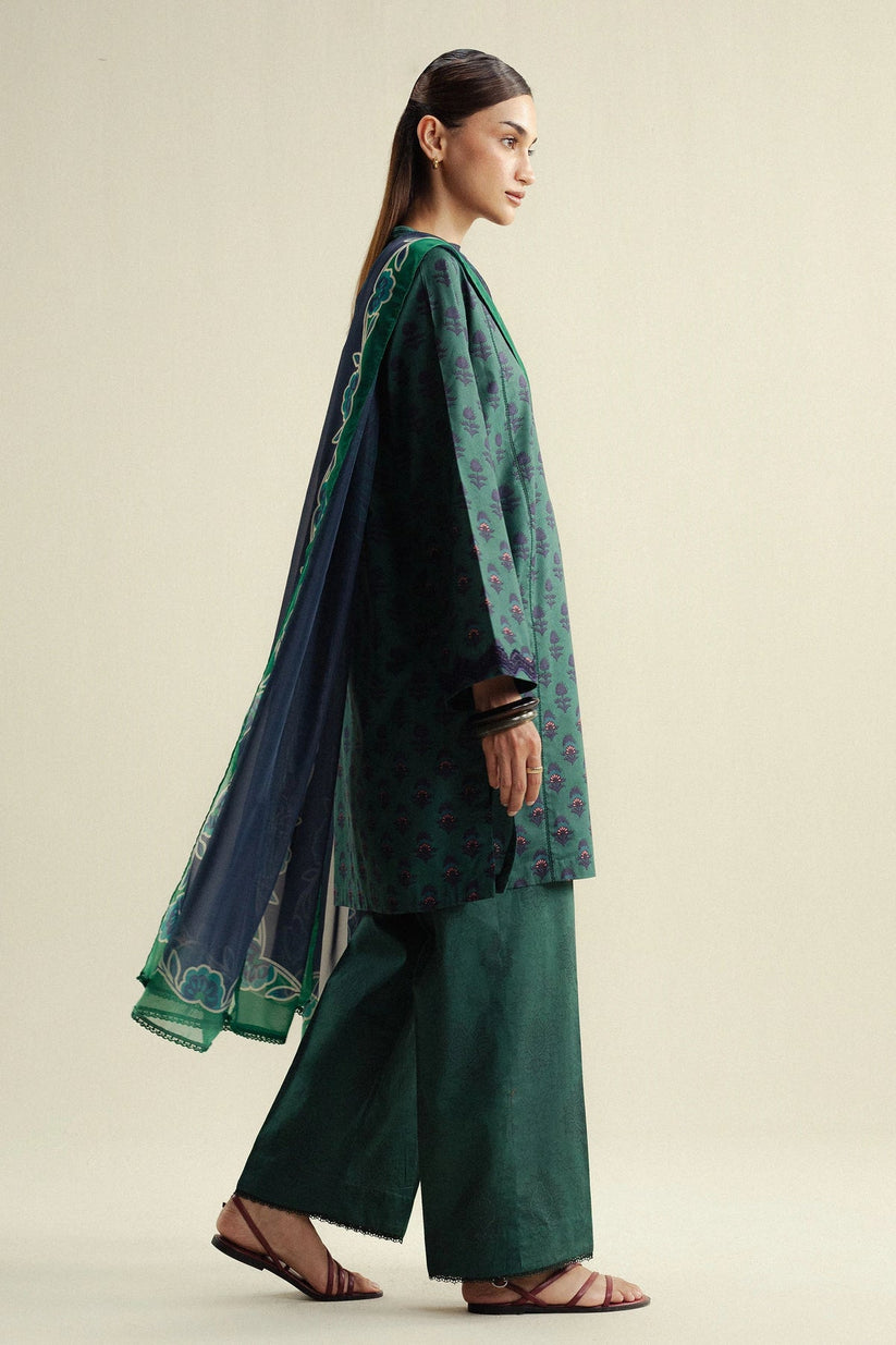 A fresh fern green shirt paired with a printed trouser and contrasted with a dark blue dupatta, balancing vibrance with depth in perfect harmony.