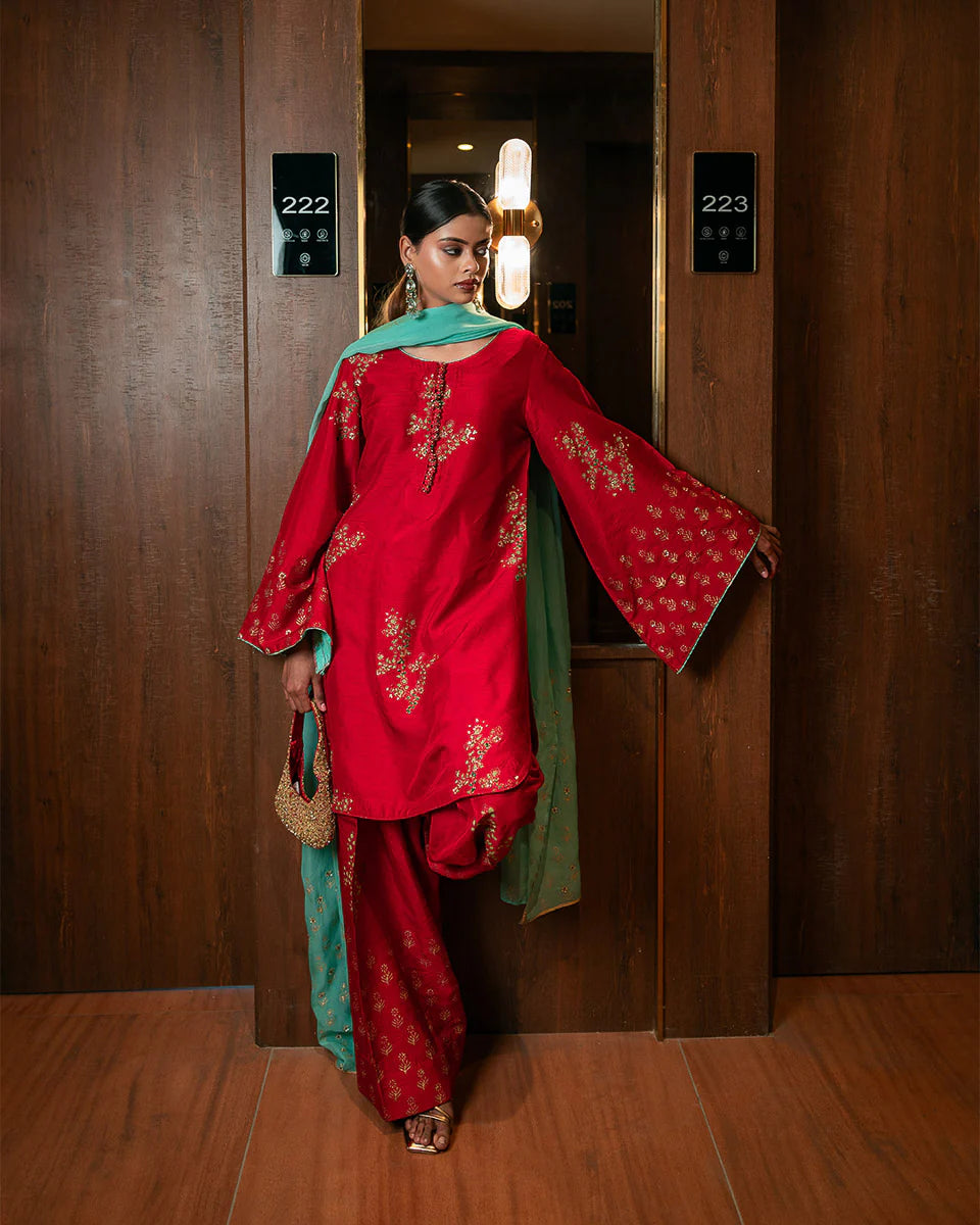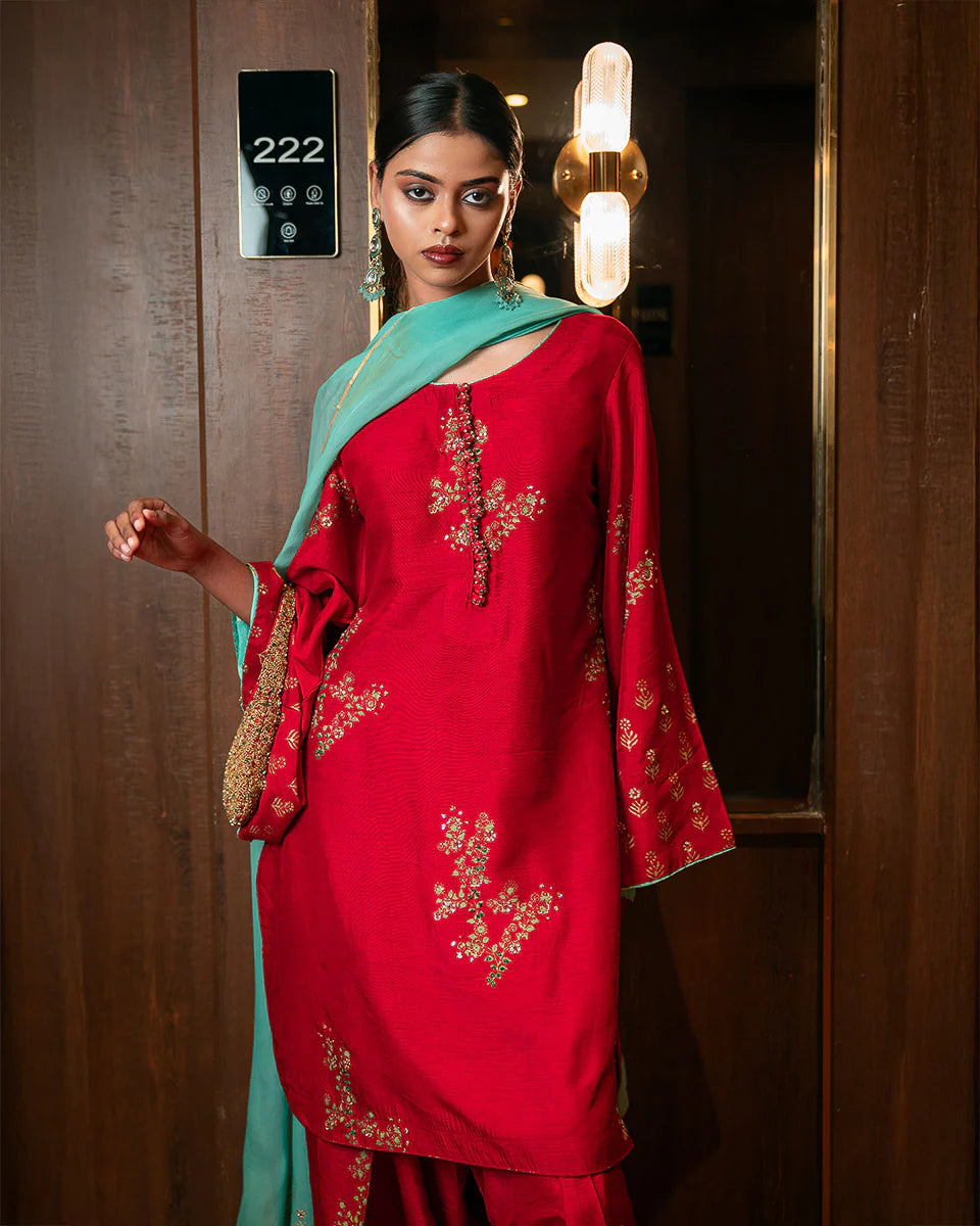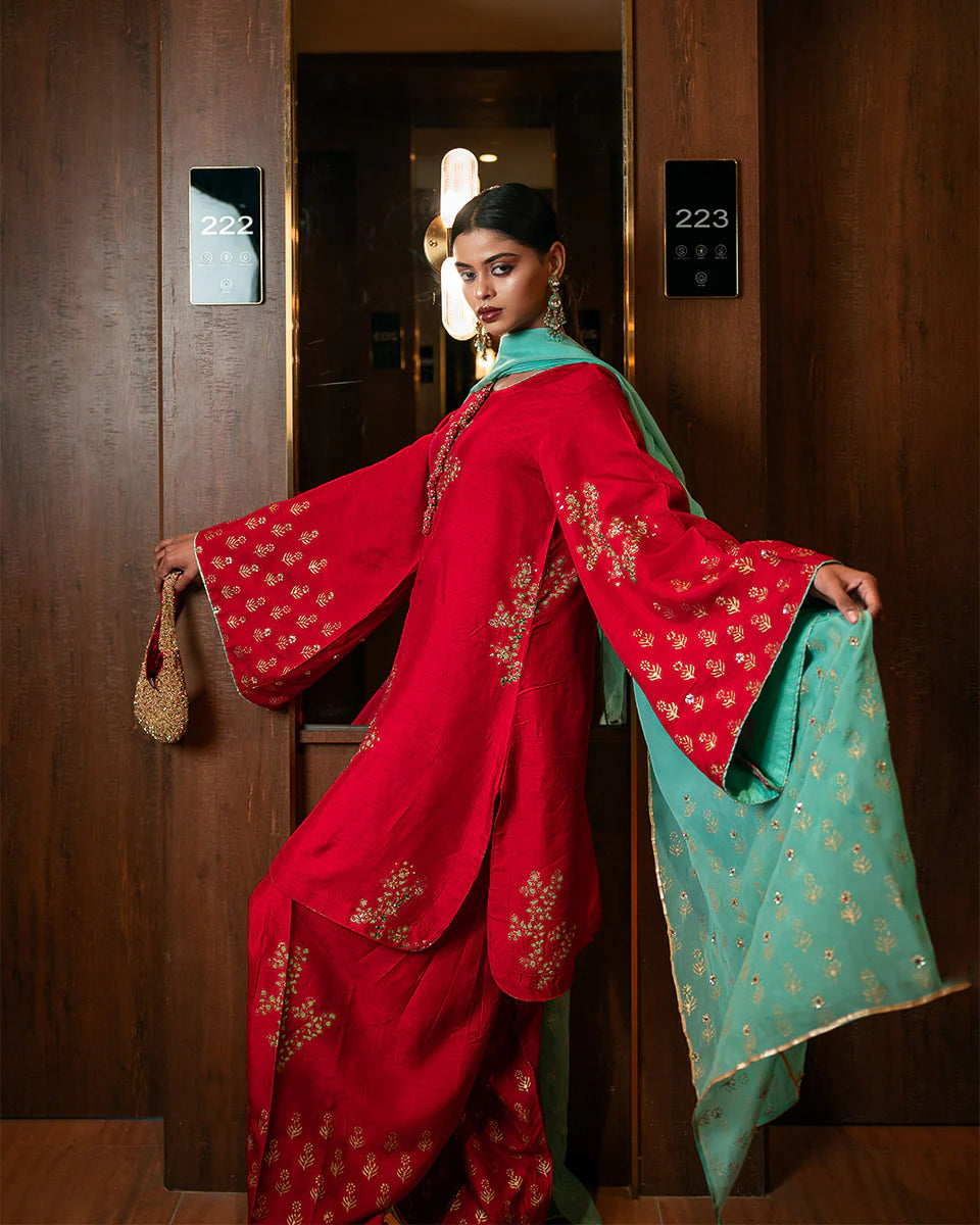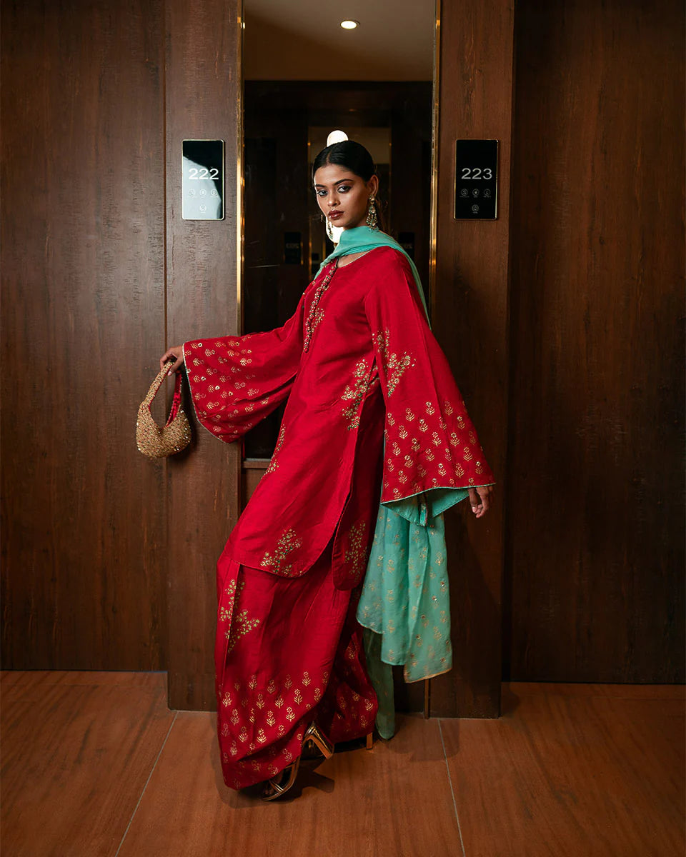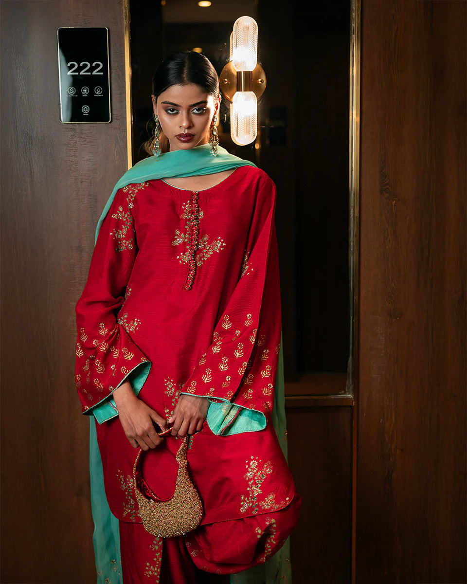 Gulaal - Immerse yourself in timeless grace with Gulaal, a masterpiece crafted for those who admire heritage charm with a contemporary twist. The shirt, tailored in luxurious raw silk, showcases intricate hand block printing and delicate handwork featuring pitta, sequins, poth, and katdana embellishments. Paired with a farshi shalwar, this ensemble reflects sophistication at its finest. The soft organza dupatta, adorned with matching hand-embellished details, adds an ethereal touch to the ensemble. Perfect for moments that demand elegance and poise.