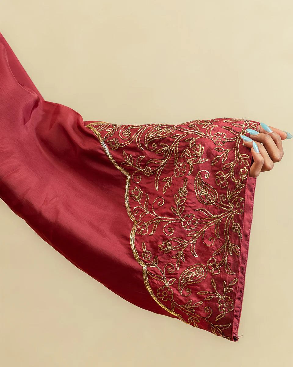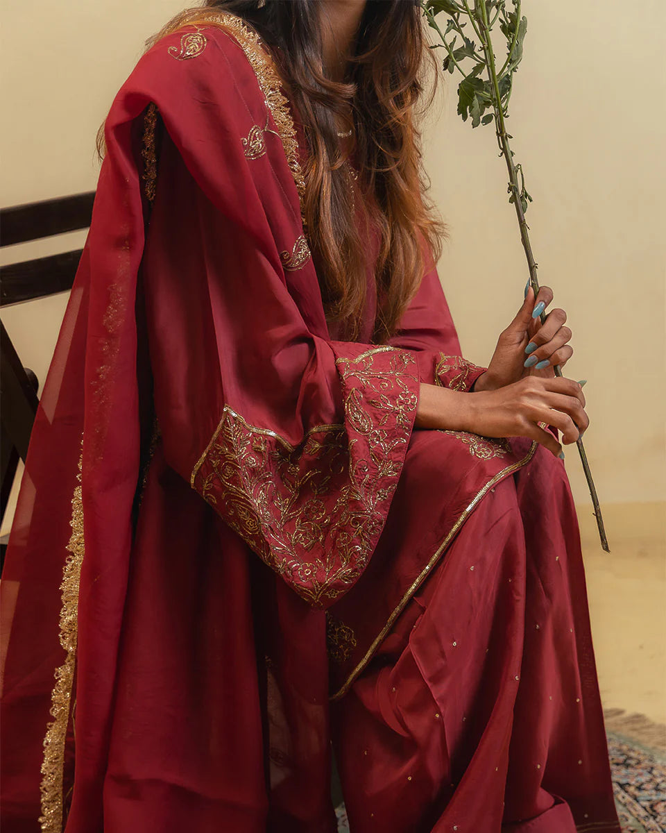 Aayat is fiery, festive, and full of feeling — crafted in a deep red silk with a short kameez and farshi shalwar, paired with an organza dupatta and adorned with intricate dabka and pitta work.
