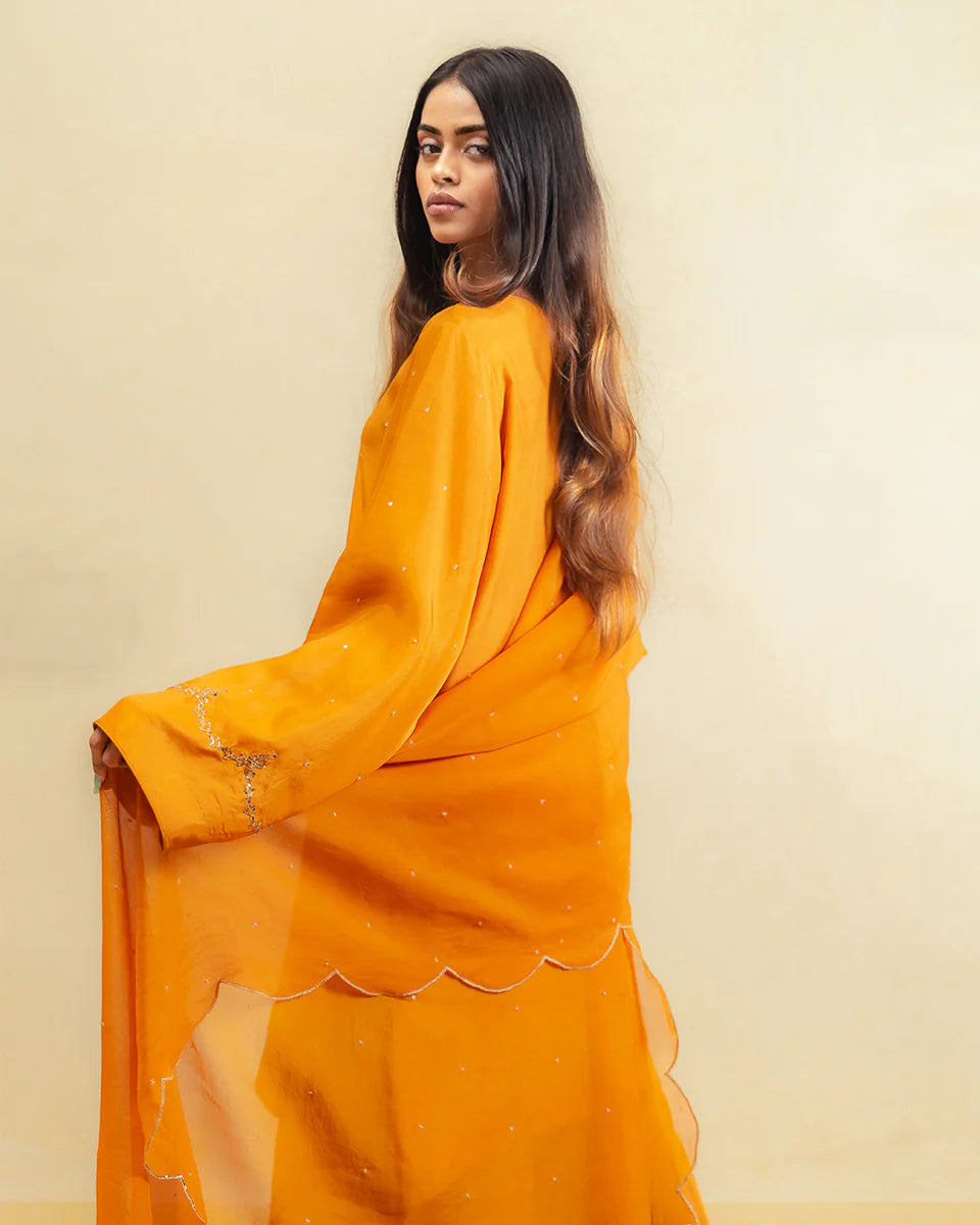 Zard is fiery, festive, and full of feeling — crafted in a deep red silk with a short kameez and farshi shalwar, paired with an organza dupatta and adorned with intricate dabka and pitta work.
