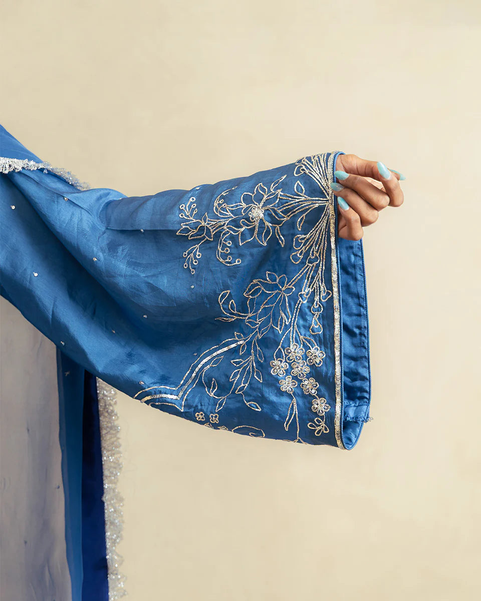 Zarmina is fiery, festive, and full of feeling — crafted in a deep red silk with a short kameez and farshi shalwar, paired with an organza dupatta and adorned with intricate dabka and pitta work.