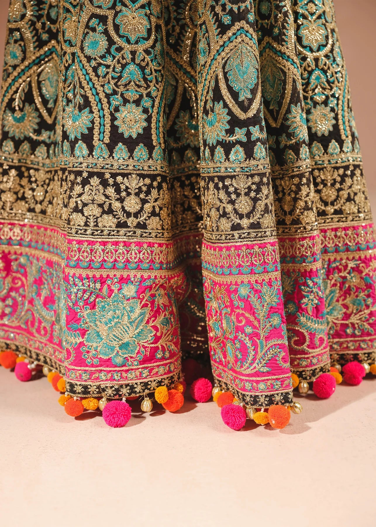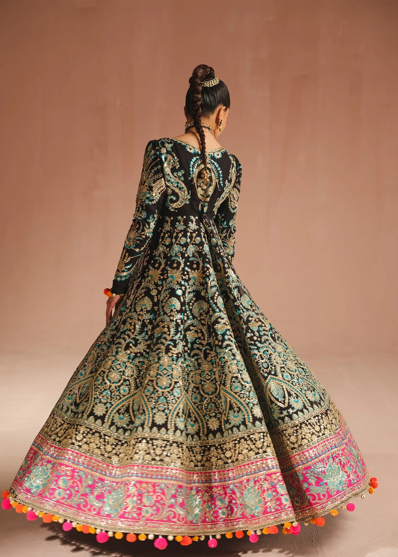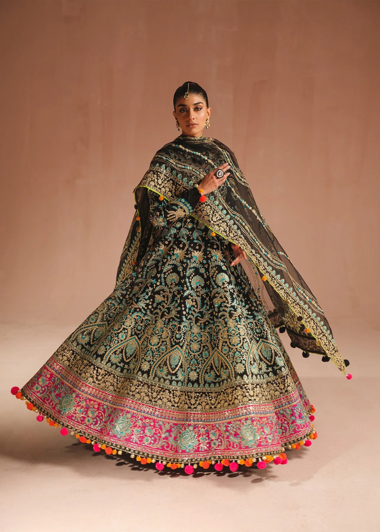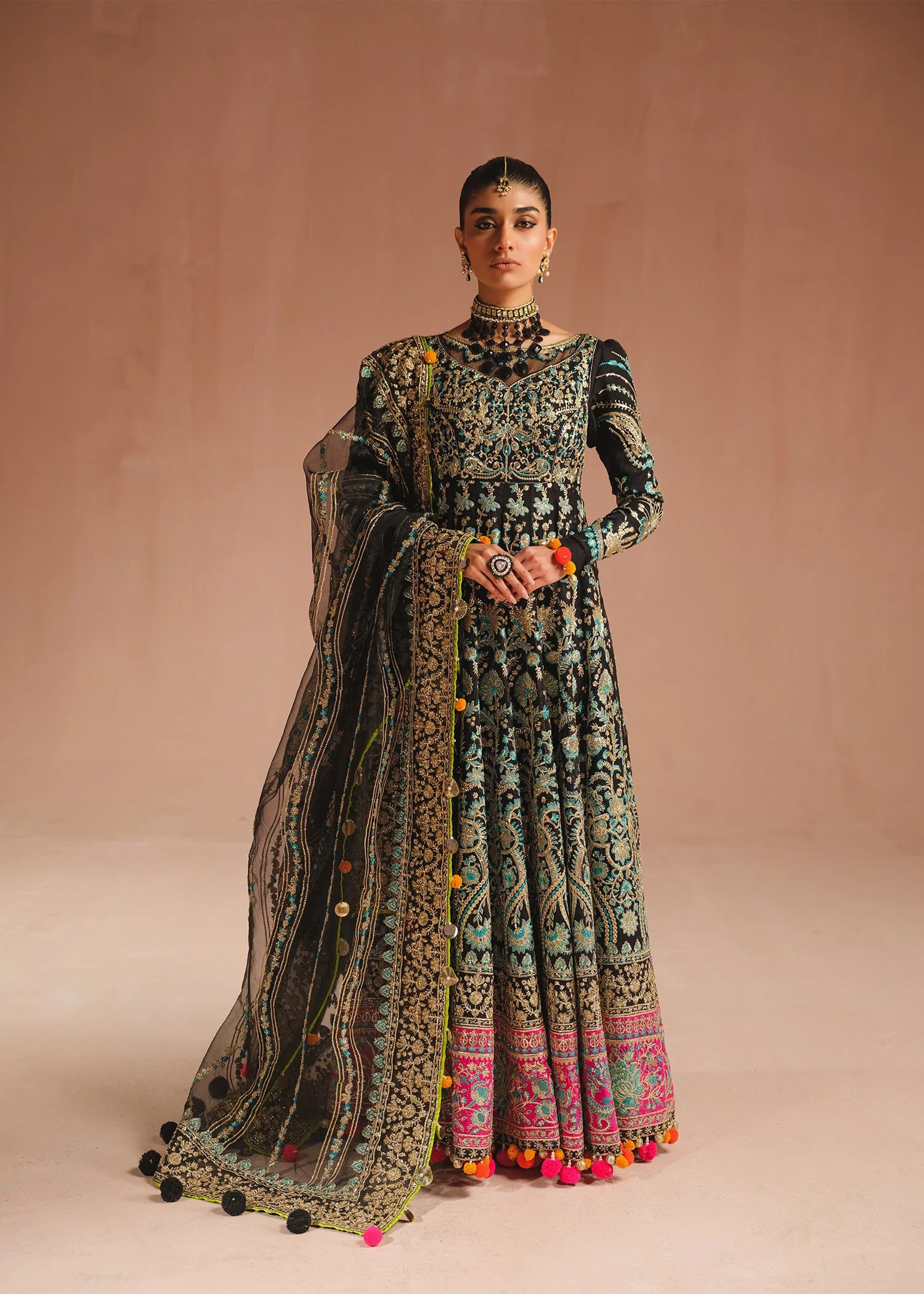 An exquisite black pishwas is adorned with opulent gold embroidery, intricate tilla, sequins and blue thread work. The jewel neckline and hot pink embroidered border adds a touch of regal elegance. Complementing the ensemble is a stunning organza dupatta framed with a beautifully embroidered border.
