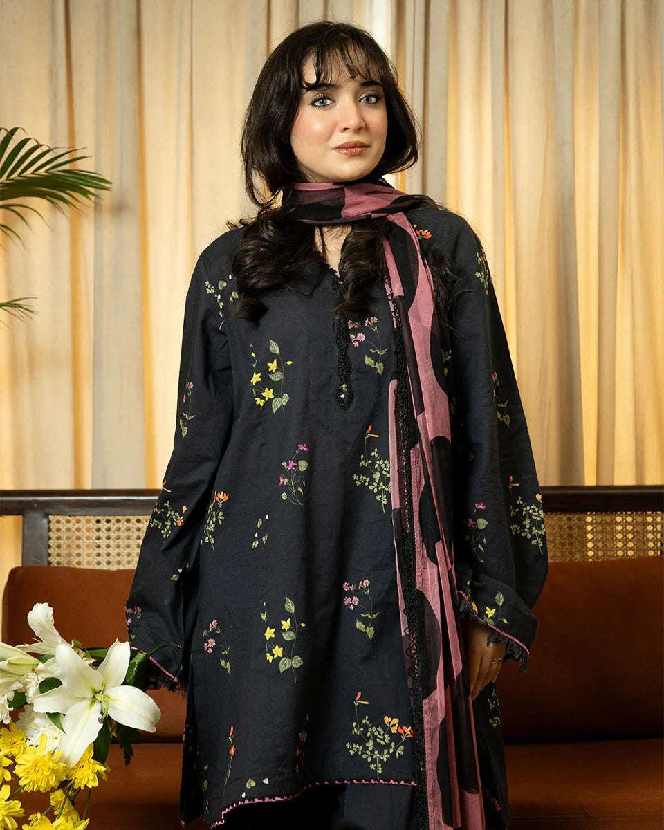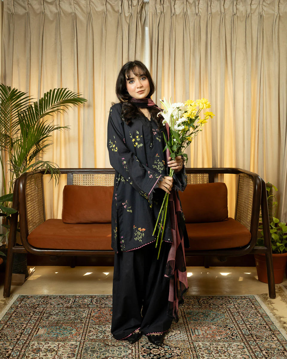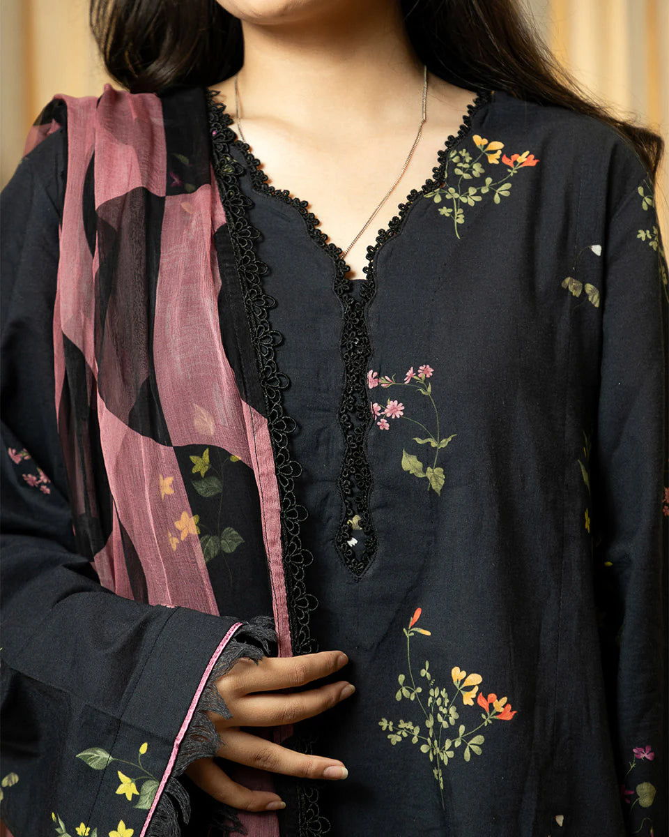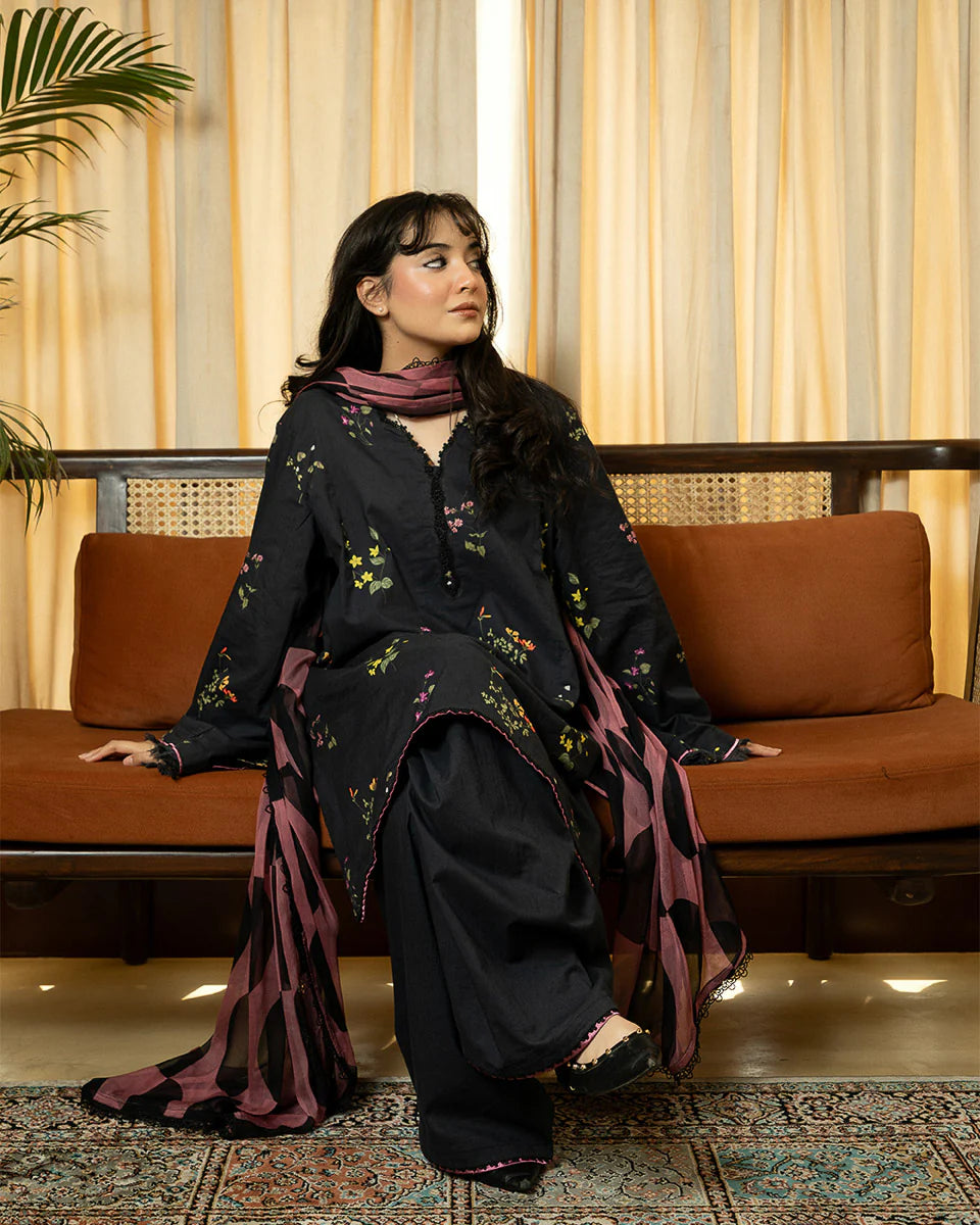 Dilnaaz is a charcoal black floral-printed short A-line kurta that beautifully balances tradition with contemporary ease. Designed with delicate fringes, fine piping, and intricate lace details, it exudes understated elegance. The addition of pockets enhances its practicality, making it a perfect choice for effortless styling. Paired with a flowing farshi shalwar and a soft pink polka-printed chiffon dupatta, Dilnaaz is a timeless ensemble that blends grace with everyday comfort.