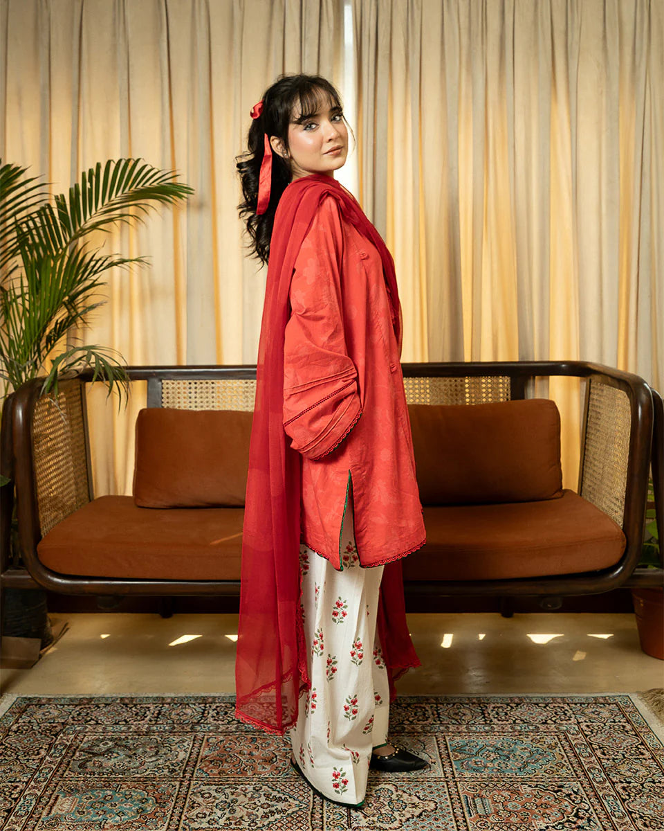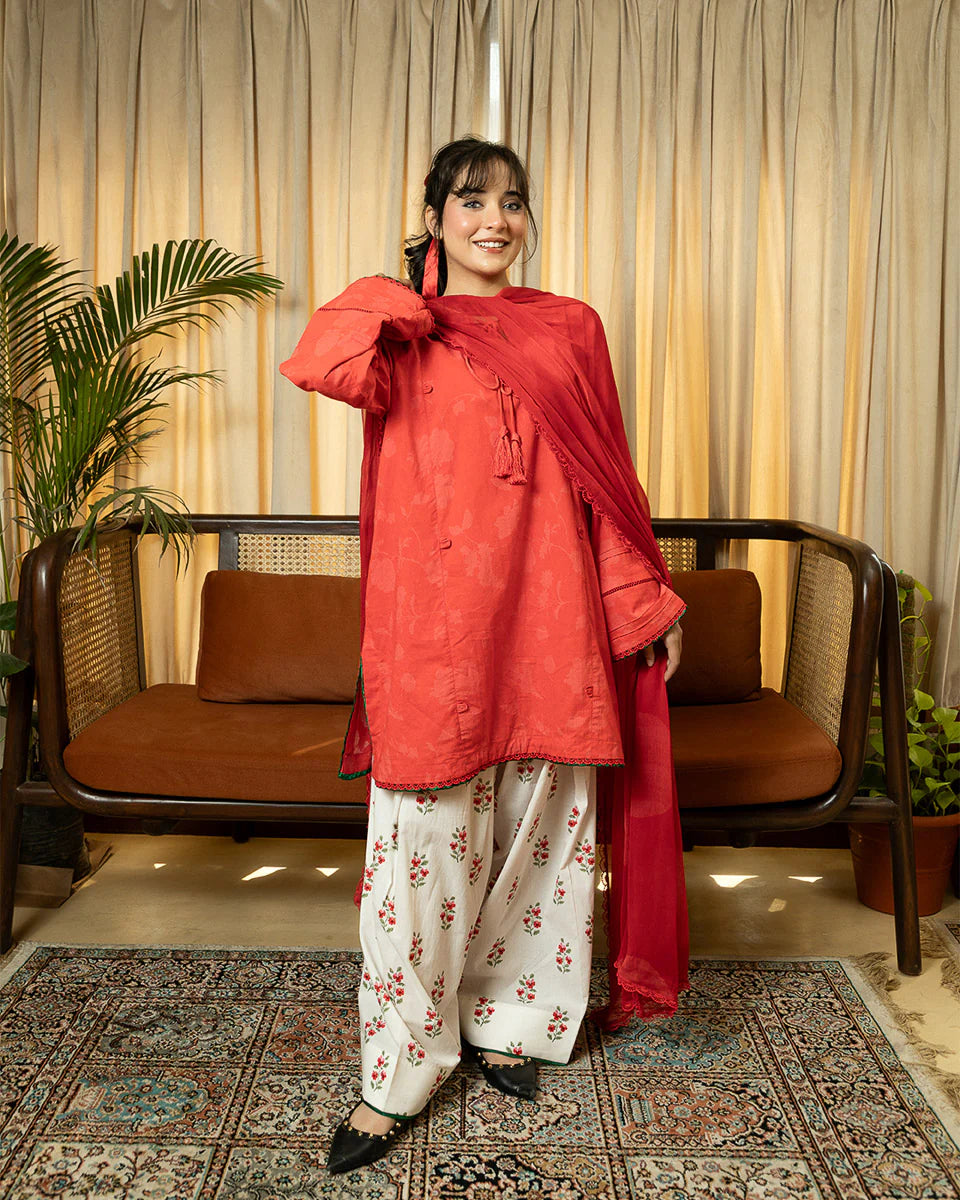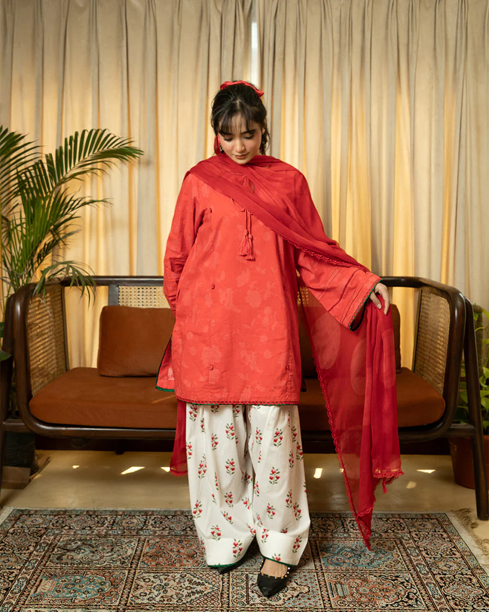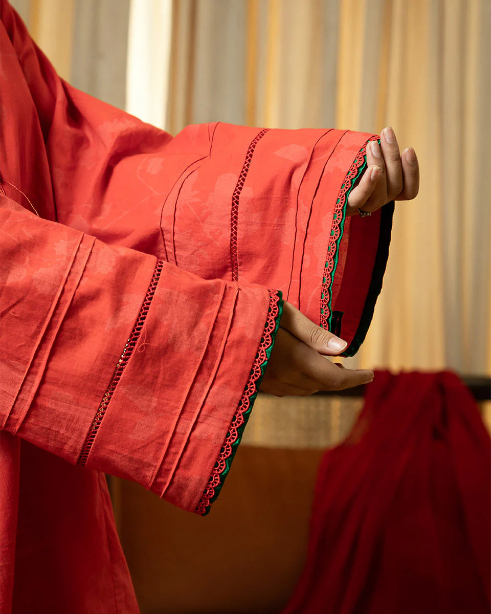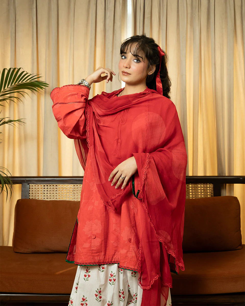Gulnaar is a vibrant red short kameez with soft shadow prints, exuding a timeless charm. Green finishing accents on the hem and sleeves add a striking contrast, while delicate lace, pintucks, and dori detailing enhance its intricate craftsmanship. Designed with pockets for added ease, the kameez is paired with a printed farshi shalwar for a flowy, traditional silhouette and a polka-printed chiffon dupatta for a playful touch. Gulnaar is a perfect fusion of heritage and modern elegance.